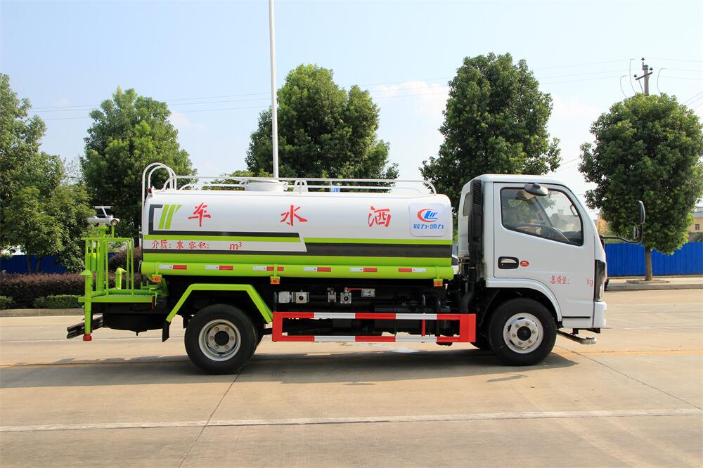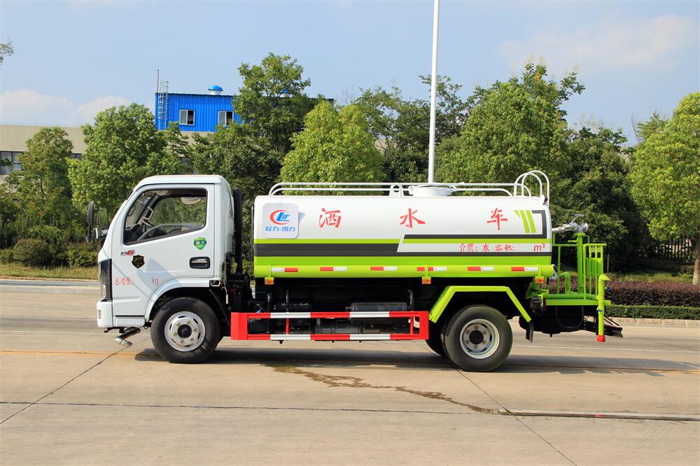 灑水車前裝有鴨形噴嘴或圓頭沖嘴,后面裝有圓柱開灑水噴嘴或蓮蓬頭噴嘴,后部有一工作平臺,裝配有水炮。后部還可裝8個噴嘴(選裝)。