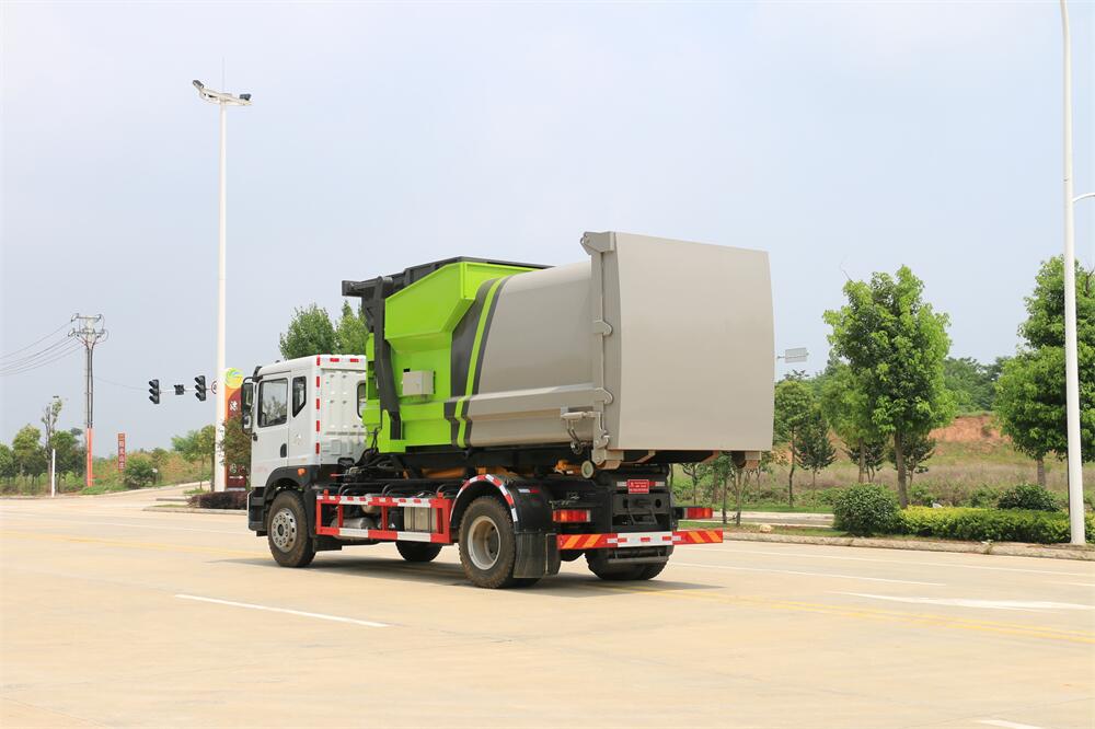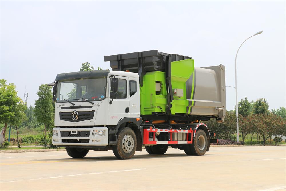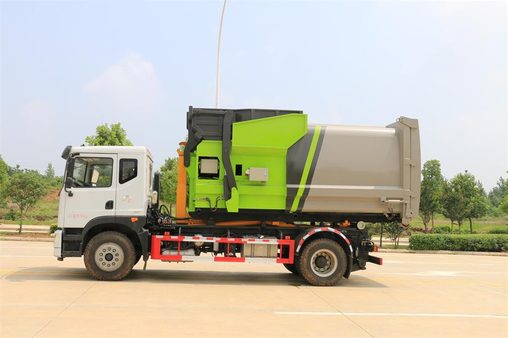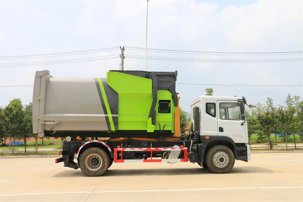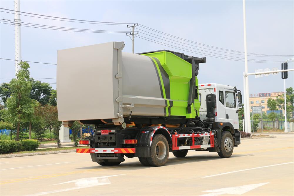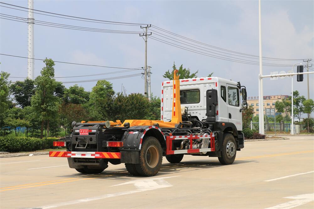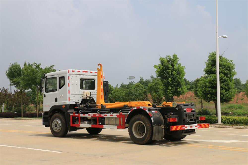 勾臂式垃圾車(車廂可卸式垃圾車)介紹: 車廂可卸式垃圾車又叫拉臂式垃圾車,是一種采用高新設計可伸縮的鉤臂,實現(xiàn)垃圾廂的二次吊裝,自吊上放下,可自行傾倒垃圾的環(huán)衛(wèi)設備。 拉臂式垃圾車結構簡單,操作穩(wěn)定方便,裝卸效率高,機械化程度高,節(jié)省人力。鉤臂垃圾車一車可帶多個垃圾廂,在裝卸的運輸過程中可有效地避免二次污染。 拉臂垃圾車采用高新設計可擺動的鉤臂,垃圾箱由框架、開啟油缸、滑輪、后門和若干加強框架與鋼板焊接而成。調(diào)換貨廂快捷方便,貨廂上帶蓋(倒垃圾時可翻開),鉤臂垃圾車垃圾廂體可選用碳鋼、不銹鋼材質(zhì)、內(nèi)部采取環(huán)氧樹脂防腐處理,改裝部分與原車底盤為可分離式,維修方便且保持了原車的機動性及行駛性能。