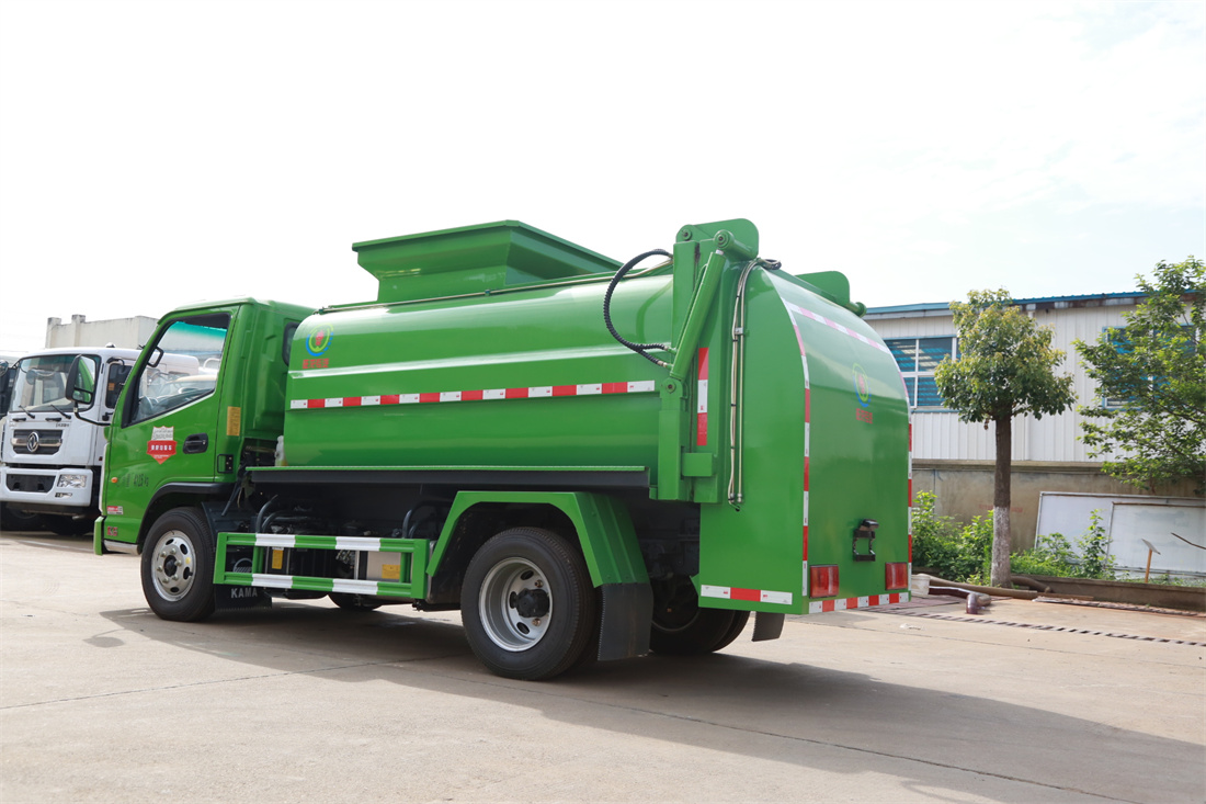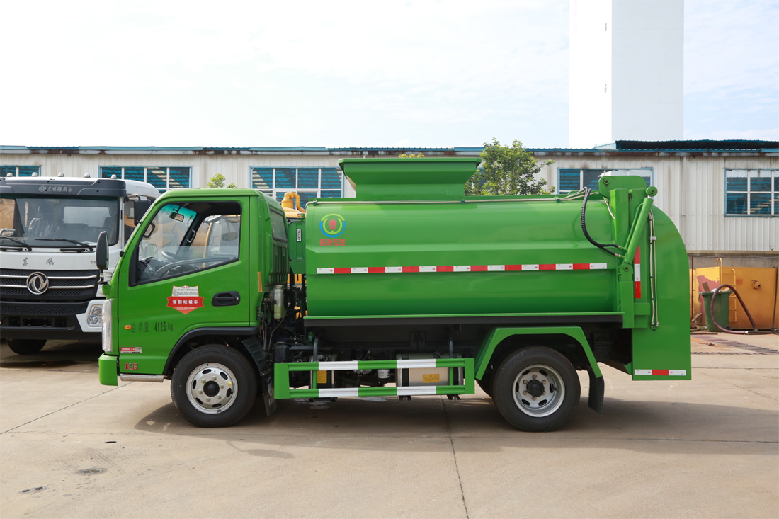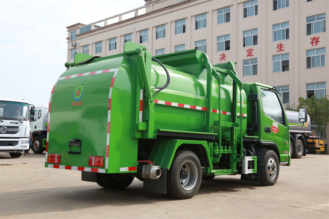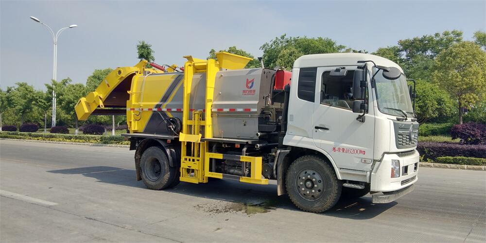 上裝配置:罐體容積4m3,配備120L/240L掛桶提升翻轉機構,液壓系統,后蓋液壓鎖緊開啟,罐體可以舉升自卸,尾部帶自流閥;用于運輸液態垃圾,其特點操作簡單,密封性好,無泄漏,無異味;可選裝固液分離功能,推板擠壓功能,常用于餐館的垃圾轉運處理。