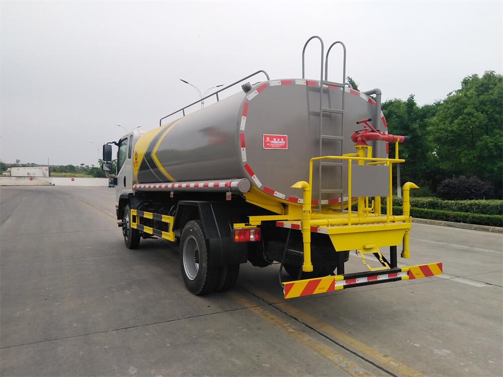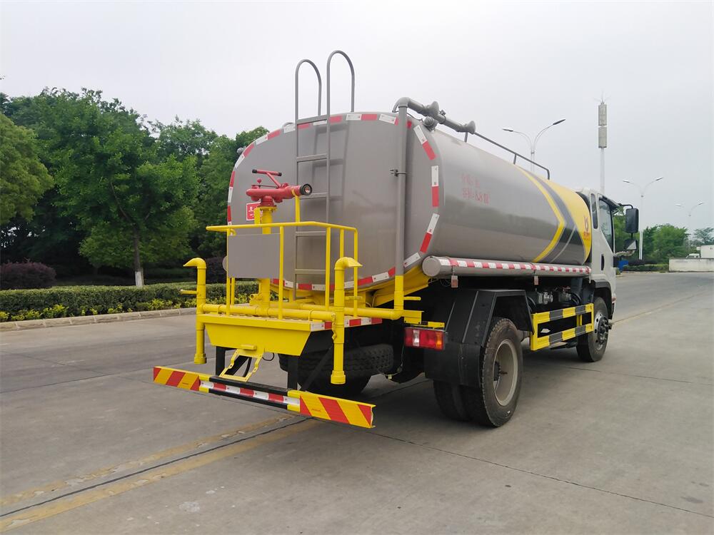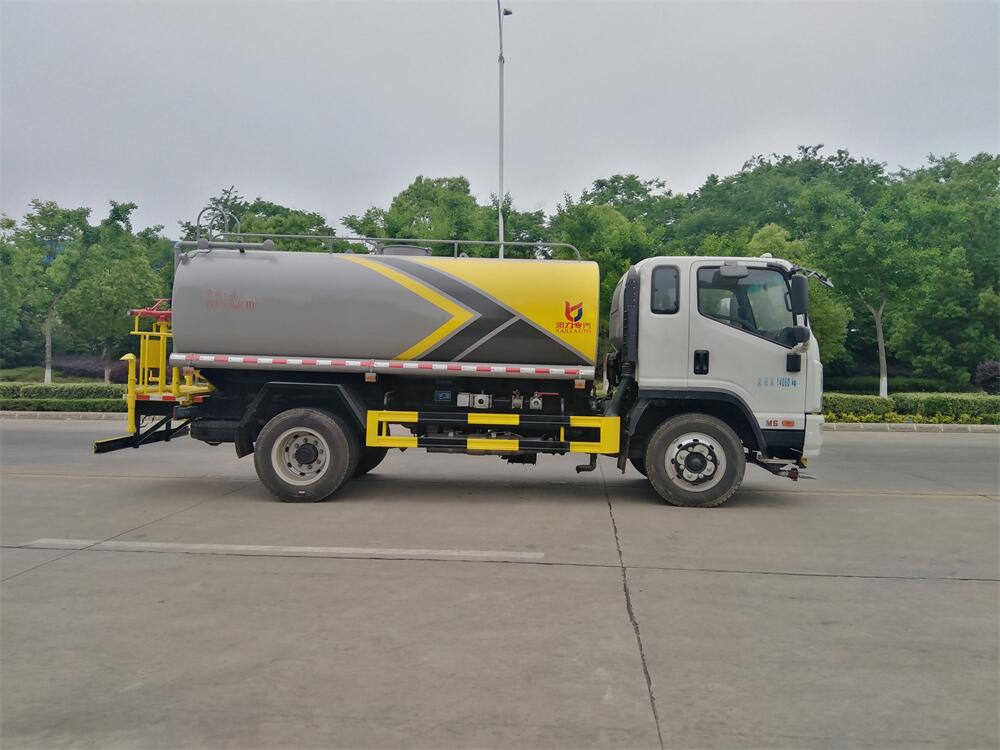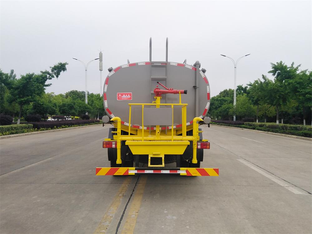 灑水車(chē)前裝有鴨形噴嘴或圓頭沖嘴,后面裝有圓柱開(kāi)灑水噴嘴或蓮蓬頭噴嘴,后部有一工作平臺(tái),裝配有水炮。后部還可裝8個(gè)噴嘴(選裝)。