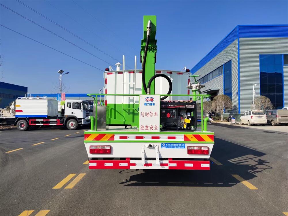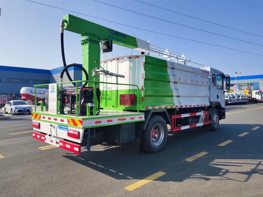 東風(fēng)D9多功能鐵路抑塵車,整車型號:CL5186TDY6YC,底盤型號:EQ1185LJ9CDE,總質(zhì)量:18000KG,整備質(zhì)量(車輛自重):9660 KG,額定載質(zhì)量:(上戶噸位):8145KG,4500軸距,大容積罐體滿載15立方(罐內(nèi)采用環(huán)氧玻璃鱗片防腐處理質(zhì)保兩年)、新穎的罐體設(shè)計使車輛行駛更穩(wěn)定、使用壽命更長,大容量方型水箱,前沖、后灑、側(cè)噴、高炮,抑塵噴灑桿(帶旋轉(zhuǎn)升降功能,液壓升降、液壓旋轉(zhuǎn))。噴灑桿離地3.5-5.6米 、180°旋轉(zhuǎn),后部平臺帶8KW柴油發(fā)電機組、電控箱。整車采用全智能駕駛室觸摸屏及遙控操作:車輛噴淋系統(tǒng)、攪拌、旋轉(zhuǎn)臂、加熱等等功能。灑水功能采用主機動力。旋轉(zhuǎn)、升降、攪拌采用發(fā)電機組動力,配電箱預(yù)留外接電源接頭套。噴淋系統(tǒng)加裝單車流量計(用于計量抑塵劑噴灑量。)