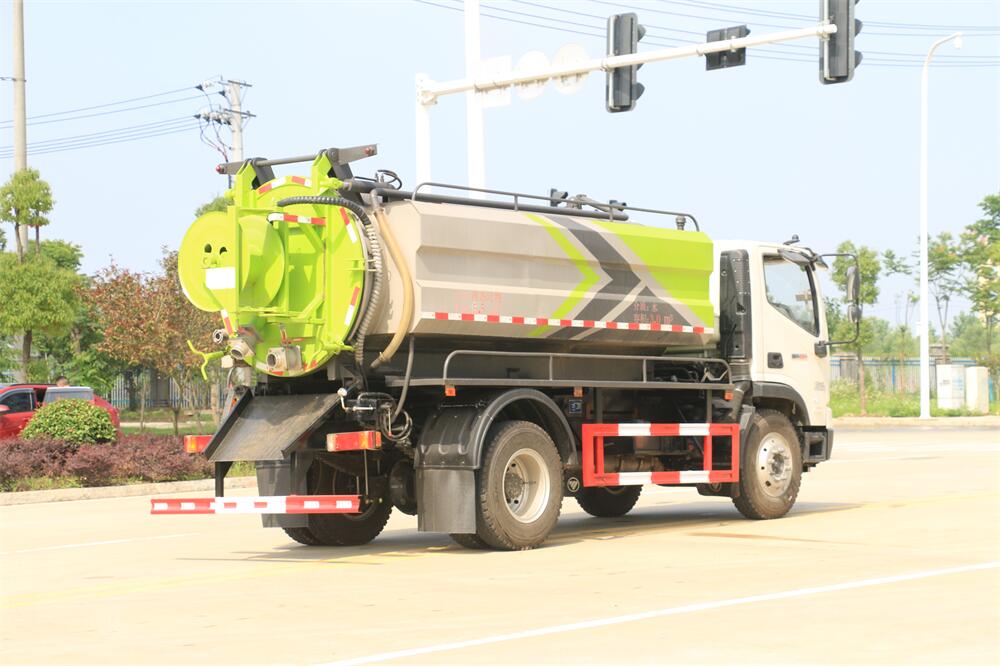 上裝配置:上裝配置:水罐4 立方,污罐 8立方;清洗 部份采用天津通潔,壓力 24Mpa,流量 215L/min,配80米直徑22高壓管帶液壓卷盤; 吸污部份采用山東 SK-15 水循環泵(億豐 10T 雙聯想真空泵),吸污罐帶舉升,后蓋液壓開 啟,帶一個 600mm 快開,罐體后尾部一個 DN150 排污口球閥,一個 DN100 進污口球閥,一個視 污窗,一根 10m 吸污管,一套陰陽端,壓力 表,防溢閥,箭頭燈,淋管裝置,高壓泵帶氣 吹水。配一個 4.5 公斤水雷噴頭,另帶一個 80 公分手持洗車噴頭。