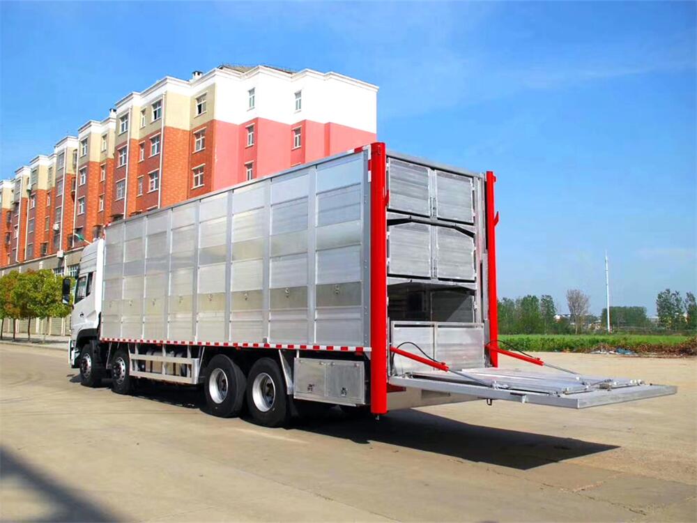 總質(zhì)量31噸,整備質(zhì)量15.5噸,額定載質(zhì)量15.3噸,整車(chē)長(zhǎng)度11.8-12米,寬度2.5-2.55米,高度3.9-3.98米,貨箱長(zhǎng)度8.3-9.3米,箱體鋁合金制作,上中下三層,帶噴淋,喂食功能,可開(kāi)關(guān)側(cè)窗,高轉(zhuǎn)速防風(fēng)通風(fēng)換氣扇。后部帶液壓升降尾板,可遠(yuǎn)程**。副車(chē)架部分采用高強(qiáng)度鋼,能更好應(yīng)對(duì)顛簸路面。帶一套備用發(fā)電機(jī)。配備冷暖空調(diào),采用全新通風(fēng)設(shè)計(jì),保證前后溫度一致。空氣清新,恒溫,有效保證畜禽成活率。設(shè)計(jì)合理,堅(jiān)固耐用,箱體內(nèi)部清洗方便,無(wú)死角,無(wú)夾縫。讓消毒更徹底。