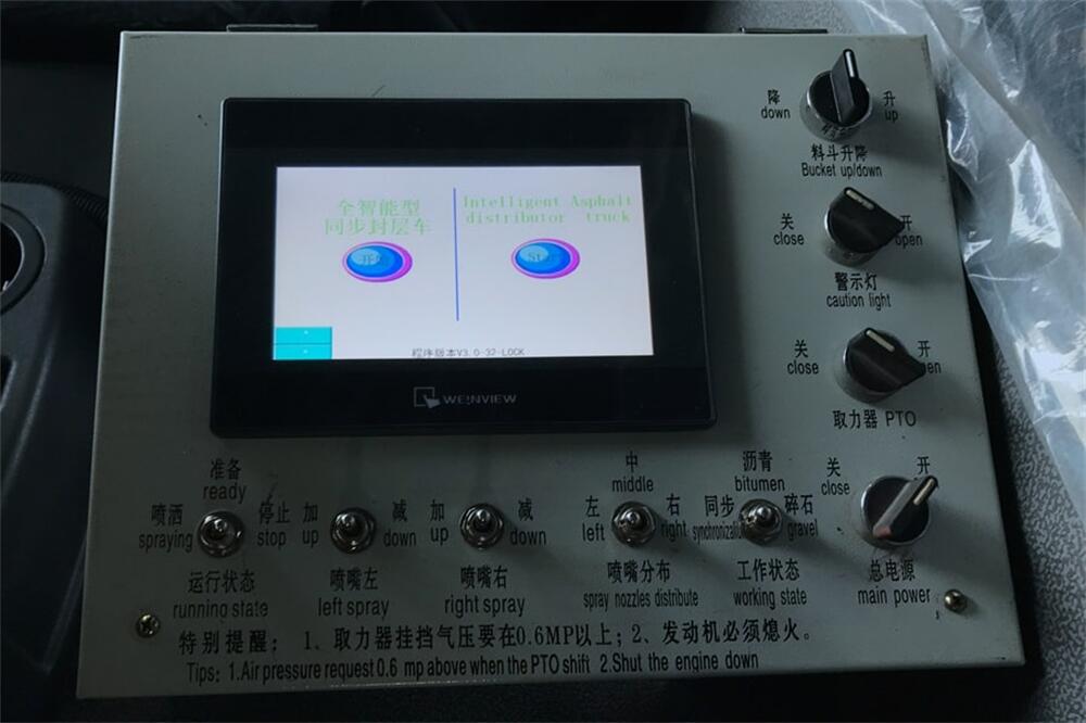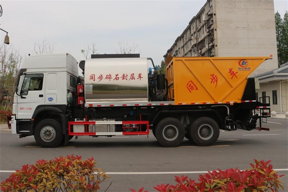 4、后雙橋同步碎石封層車完全采用電氣**,自動化程度高,,能**的計算出設備在施工過程中瀝青噴灑量和石屑撒布量的多少;